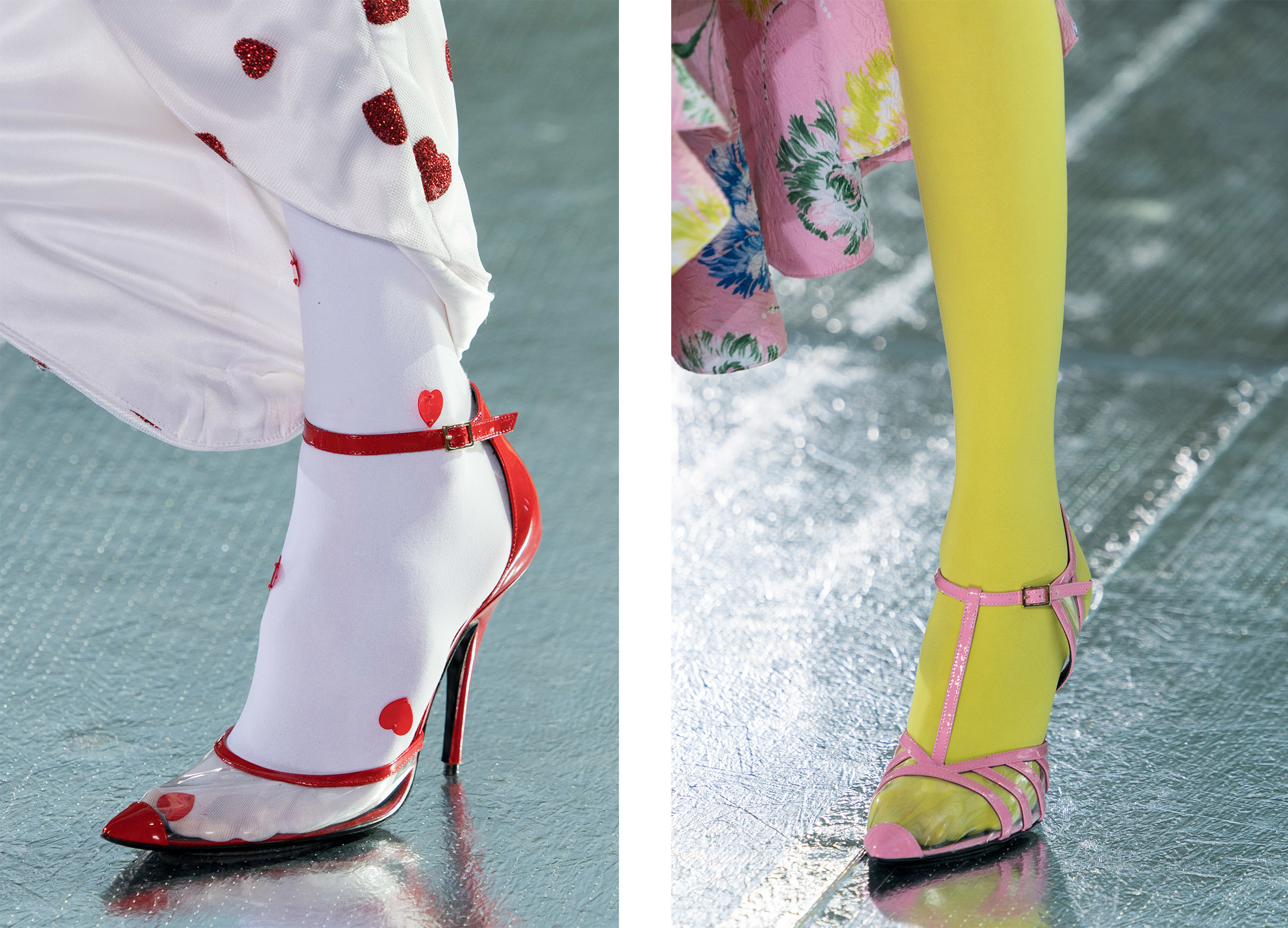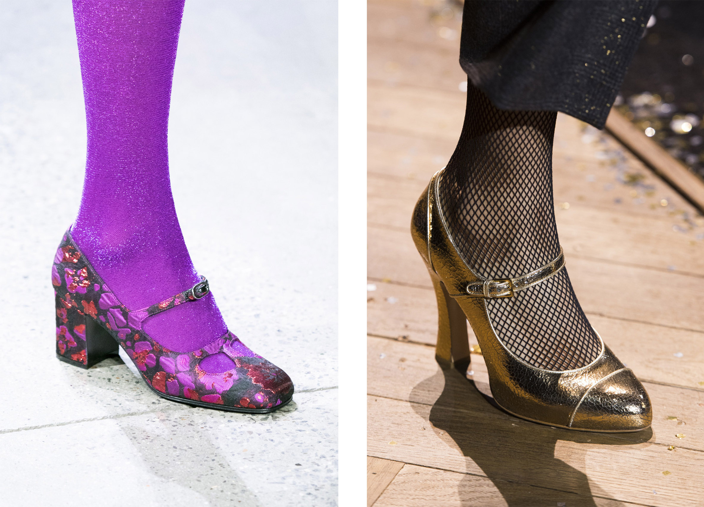 在2019年秋冬秀场上,我们可以看到这种趋势继续席卷时尚圈,设计师们为我们呈现了色彩、设计和材质更加丰富的玛丽珍鞋。Anna Sui 在鞋面上添加了具有古典风格的印花,搭配跟印花颜色互相呼应的袜子,更显复古优雅。金属材质的玛丽珍鞋追随了2019秋冬的流行元素,复刻了90年代的风格的同时又具有未来感。充满浪漫主义情怀和戏剧性的 Rodarte 也贡献了几款尖头玛丽珍鞋,鞋头以透明 PVC 包裹,结合艳丽的色彩和心型印花袜,既优雅又古怪有趣。