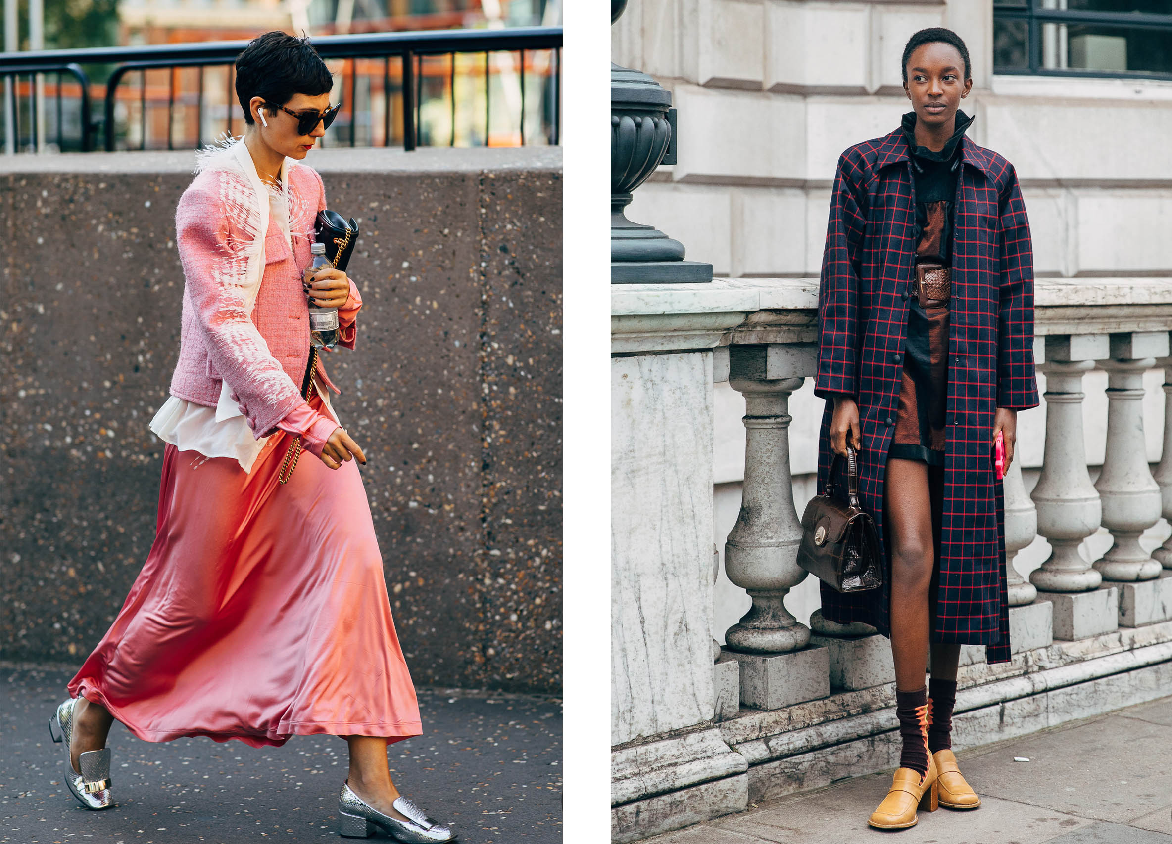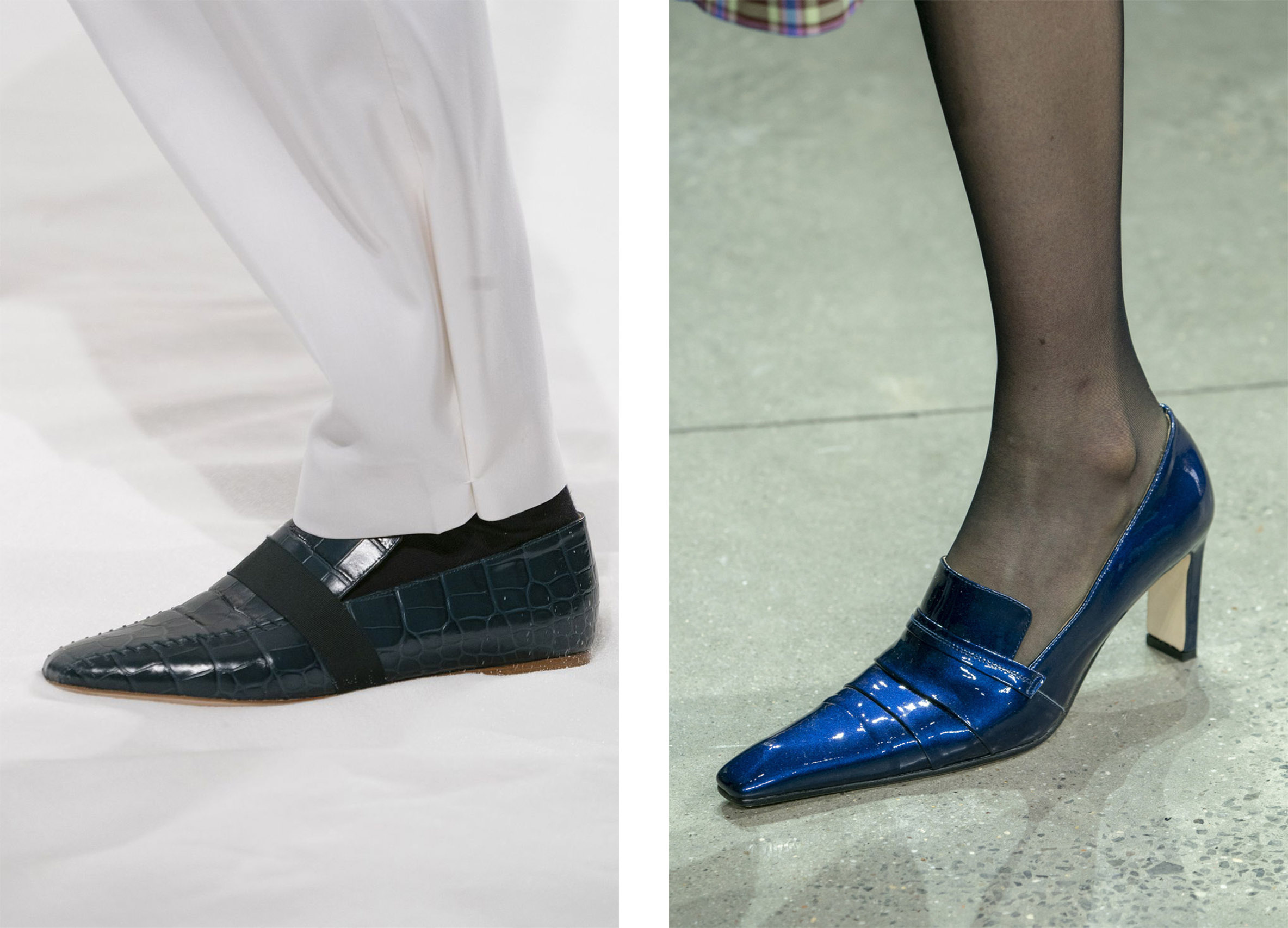在本季的秀场上,乐福鞋的款式设计更加多样,除了经典的平底款,还有复古方头的粗跟版本,在颜色和材质上也更加丰富。搭配长裙短裙,紧身裤或阔腿裤,都能跟整体造型平衡得刚刚好。