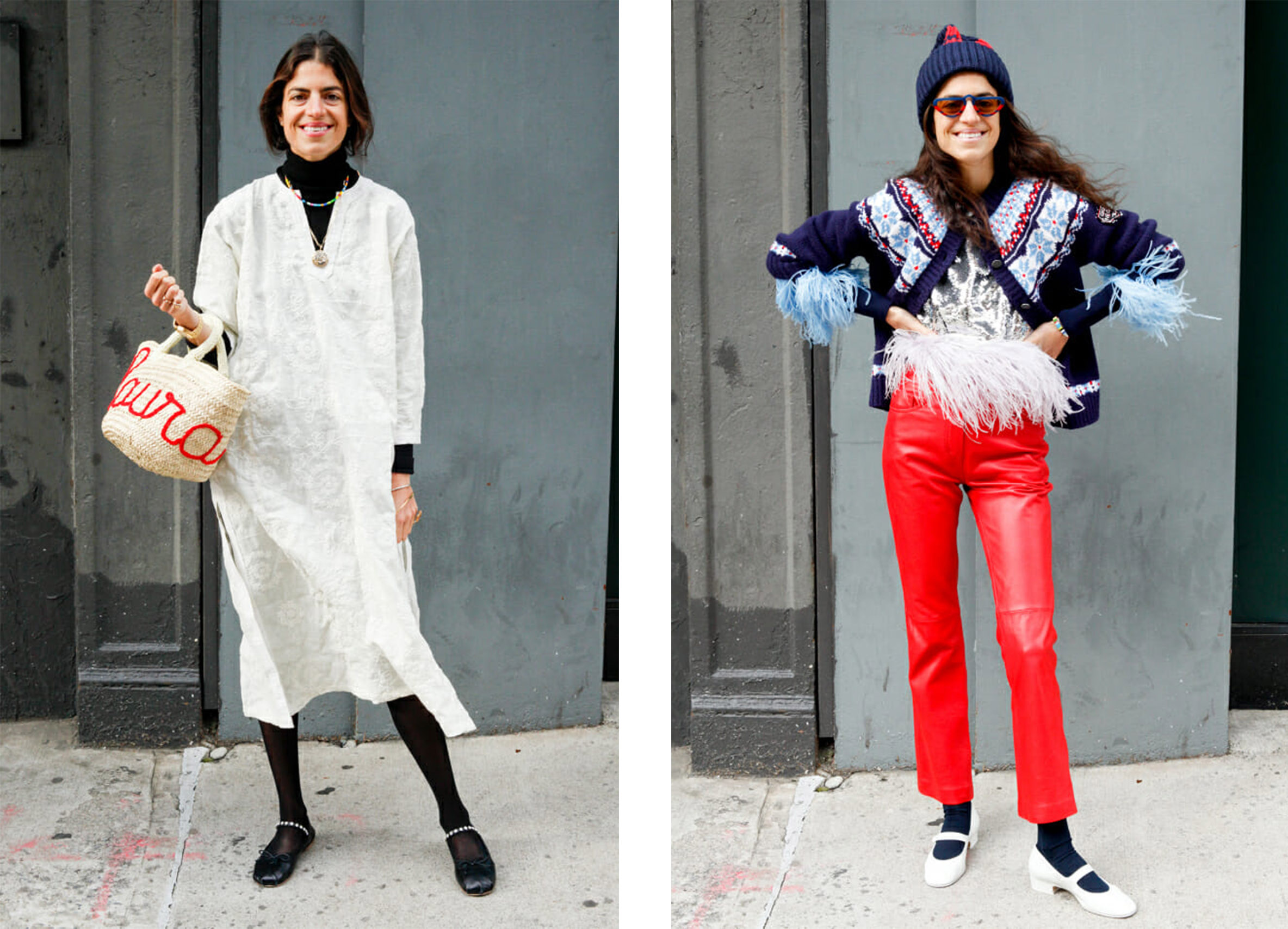 时装博主 Leandra Medine 的搭配风格跟 Alexa 其实有异曲同工之处,但比 Alexa 多了些趣味性,色彩更加丰富大胆,用玛丽珍鞋搭配直身连衣裙和红色皮革九分裤也是不错的选择。