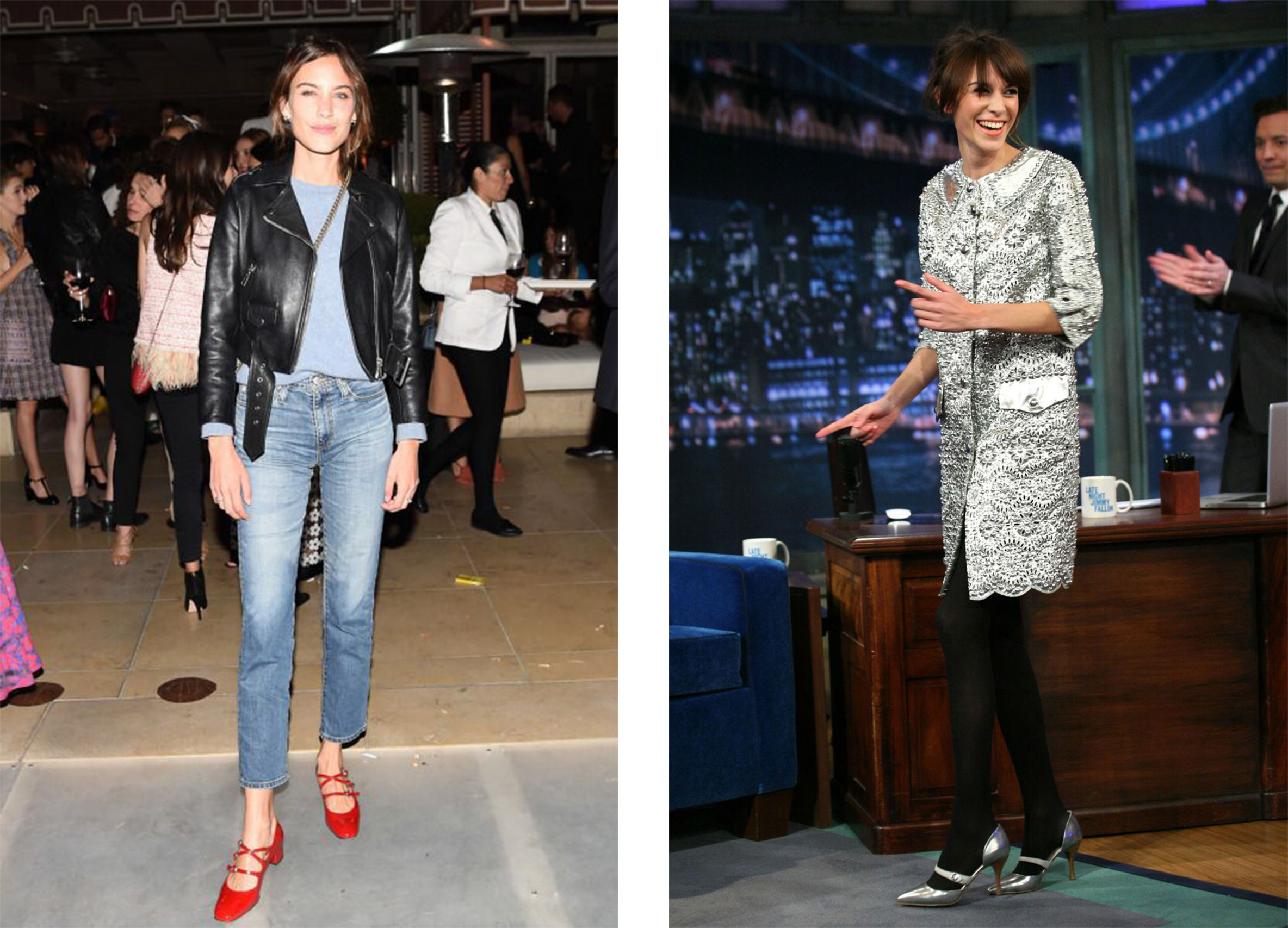 英伦「It Girl」Alexa Chung 一向是玛丽珍鞋的簇拥者,我们几乎在所有场合上都看到过 Alexa Chung 穿着玛丽珍鞋出现,无论是日常中搭配牛仔裤,还是参加红毯活动搭配礼服,Alexa 总能演绎出自己又 Chic 又复古的风格。