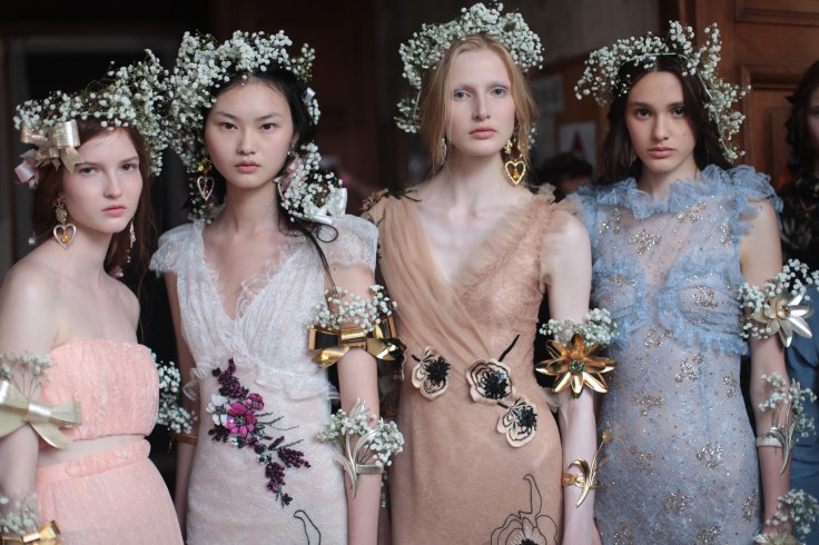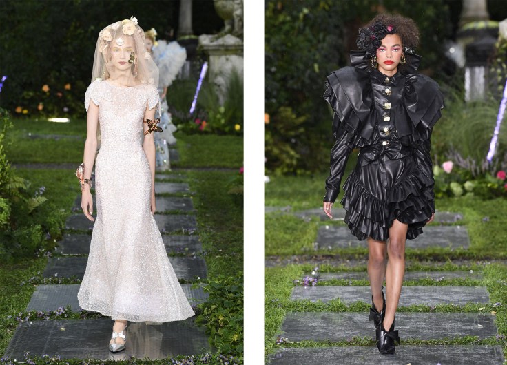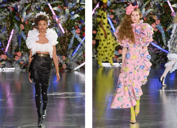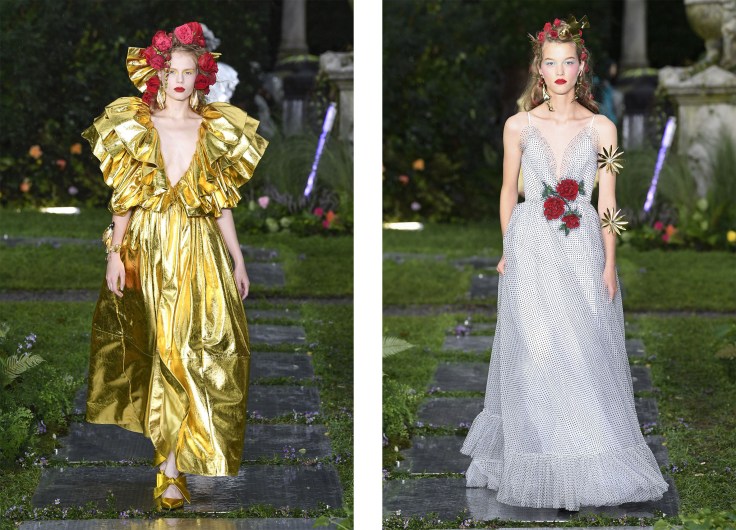 这一季以各色各样的花朵为灵感的设计元素非常女性化,连黑色的皮衣也加上了褶边装饰,突出了 Rodarte 的美学理念;80年代流行的荷叶边和金属光泽面料礼服,在夜色中闪闪发光。