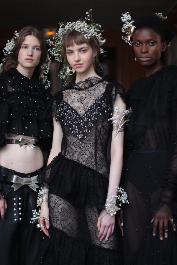 肃穆的全黑礼服和戴有面纱和连帽斗篷的造型,以及突然下起的漂泊大雨,为秀场赋予了更诡异神秘的气氛;新鲜的花朵被编进了模特的头发里,跟礼服上的花朵刺绣交相辉映。